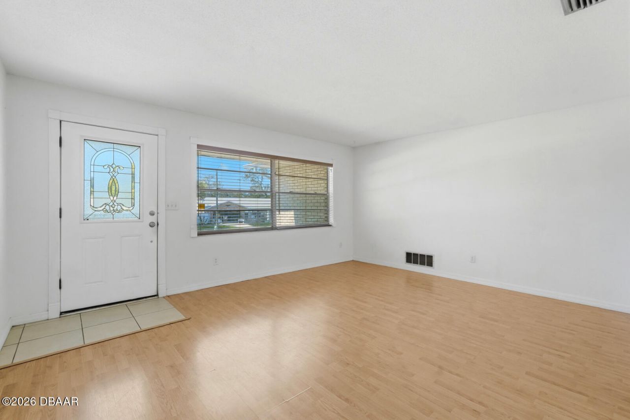 1077 Chelsea Way is a solid brick ranch in the established Kingswood neighborhood of Port Orange. This 3-bedroom, 2-bathroom home sits on an oversized lot and offers a flexible layout with plenty of room to make it your own. The home does need updating, but the bones are here -- and a brand new roof will be installed prior to closing. Inside, you will find a spacious living room with laminate wood floors leading into a family room with half-wall columns that open to the kitchen and dining area. The layout gives you both a formal living room and a casual family space. The kitchen has white cabinetry, stainless steel appliances (range, dishwasher, refrigerator, and microwave), and good overhead lighting. The adjacent dining area has tile floors, a chandelier, and French doors leading to the Florida room. The primary bedroom features laminate floors, a ceiling fan, and an en-suite bathroom. Two additional bedrooms with laminate floors and ceiling fans round out the sleeping spaces. The large Florida room adds bonus living space with wraparound windows, its own exterior door, and a ceiling fan. It is a versatile room that could serve as a second family room, office, playroom, or whatever you need it to be. Outside, the property has a large, fenced backyard, a storage shed, and a 2-car garage with built-in shelving and washer/dryer connections. A covered front porch with railing sits at the entry. This is an opportunity to get into the Kingswood neighborhood at an accessible price point. You are minutes from Port Orange schools, Dunlawton Avenue shopping and dining, I-95 access, and a short drive to the beach. New roof at closing, solid brick construction, and an oversized lot -- bring your vision and make it yours.