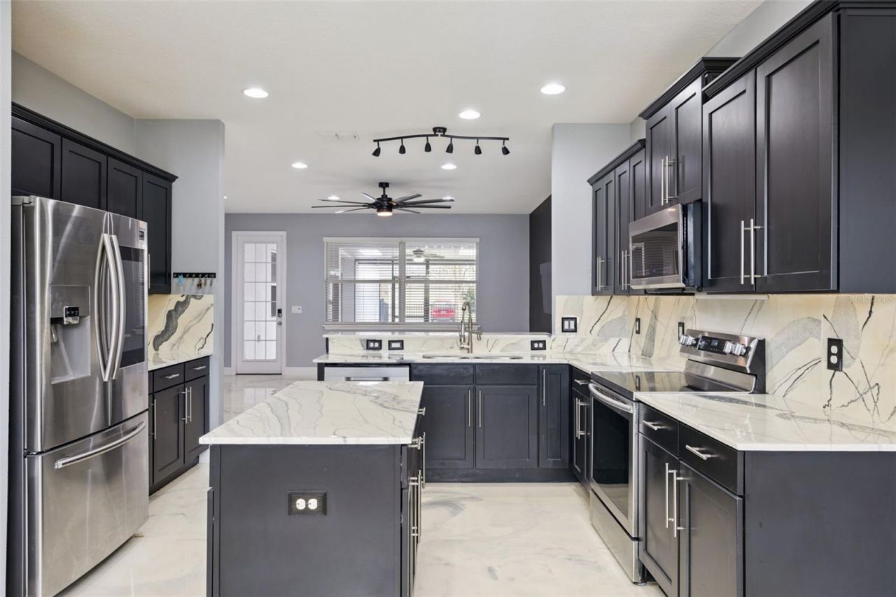 Welcome to 1128 Alston Bay Blvd in the highly desirable Emerson Park-where style, comfort, and thoughtful upgrades come together in this stunning 4-bedroom, 3.5-bath home with 2,675 heated sqft. From the moment you arrive, you'll love the eye-catching curb appeal featuring a manicured lawn, modern exterior paint, and a charming paver front porch with an extended walkway. Inside, the open-concept layout is filled with natural light, highlighted by high-gloss epoxy tile flooring, recessed lighting, and a seamless flow perfect for everyday living and entertaining. The beautifully updated kitchen is the heart of the home, showcasing quartz countertops with epoxy finishes, a large island, breakfast bar, tiled backsplash, ample cabinetry, and smart stainless steel appliances-including a WiFi-enabled Samsung touchscreen refrigerator. Step into the family room overlooking the huge screened lanai that comes with a mounted smart TV and a built-in entertainment center for added convenience. The First-Floor Primary Suite offers ample space towards the rear lanai, plus a luxurious En-Suite bathroom with dual vanities, a walk-in closet, and a sleek glass-enclosed tiled shower. A bonus Flex Room adds the perfect space for a home office. Upstairs features a spacious loft perfect for things like a kid's playroom or in-home theater. You'll also find the three additional guest bedrooms, and two full bathrooms-ideal for guests or family. Step outside to your fully fenced backyard and enjoy the massive screened lanai with pavers flooring, fans and a skylight-perfect for relaxing or hosting year-round. Rear 2 car garage access with epoxy flooring adds extra privacy and charm. Major upgrades include a Brand New Roof (2024) and a Fully Updated AC system (condenser, coil, compressor, and heating elements all new), a PRO+AQUA Elite Whole House Water Filter System and Water Softener Bundle, a Hunter Irrigation System, plus an updated Washer and Dryer in a large laundry room with ample storage near the half bathroom. Enjoy resort-style amenities in Emerson Park, including a Clubhouse with Fitness Center, Resort-Style Pool with Cabana, Playground, two Dog Parks, and scenic walking paths throughout the community. Don't need to leave too far out the neighborhood to have close access in a prime location near Wekiwa Springs State Park and Kelly Park for outdoor adventures. Conveniently close commute to major cities like Orlando, Winter Garden, Winter Park, and Mount Dora with quick and easy access to SR-429, SR-414, and I-4, plus endless shopping, dining, and entertainment nearby. Schedule your private showing Today to make the beauty YOURS-this gem truly stands out!!