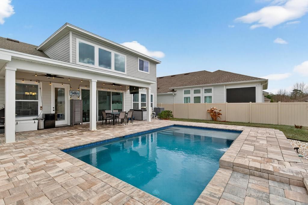 Luxury POOLSIDE Living on a Private Cul-de-Sac in eTown! Step into a grand, light-filled interior highlighted by soaring double-height ceilings in the family room and walls of windows that flood the space with natural light. At the heart of the home is a true gourmet kitchen designed to impress, featuring quartz countertops, double-stacked cabinetry to the ceiling with crown molding, and an oversized island perfect for entertaining. The open-concept layout offers both elegance and functionality, with a formal dining room for special gatherings and a private front office with French doors. Large oversized sliders lead to a spectacular outdoor retreat. The covered lanai overlooks a fully paved backyard oasis complete with a saltwater pool with extended sun shelf, and raised fire pit, creating the ultimate Florida lifestyle experience. The luxurious owners suite is conveniently located downstairs and offers a spa-inspired bath. Upstairs, an open loft provides flexible living space, while the thoughtfully designed guest accommodations include one bedroom with a private full en-suite bath. Another oversized guest room features walk-out storage for added functionality. Located in the heart of Jacksonville, eTown is one of the citys premier master-planned communities, known for its modern design, resort-style amenities, and unbeatable convenience. Residents enjoy access to a state-of-the-art amenity center, fitness facilities, pool, walking trails, and beautifully maintained green spaces, all just minutes from St. Johns Town Center, major highways, top-rated schools, dining, and the beaches. This is luxury, lifestyle, and location, all in one exceptional home.
