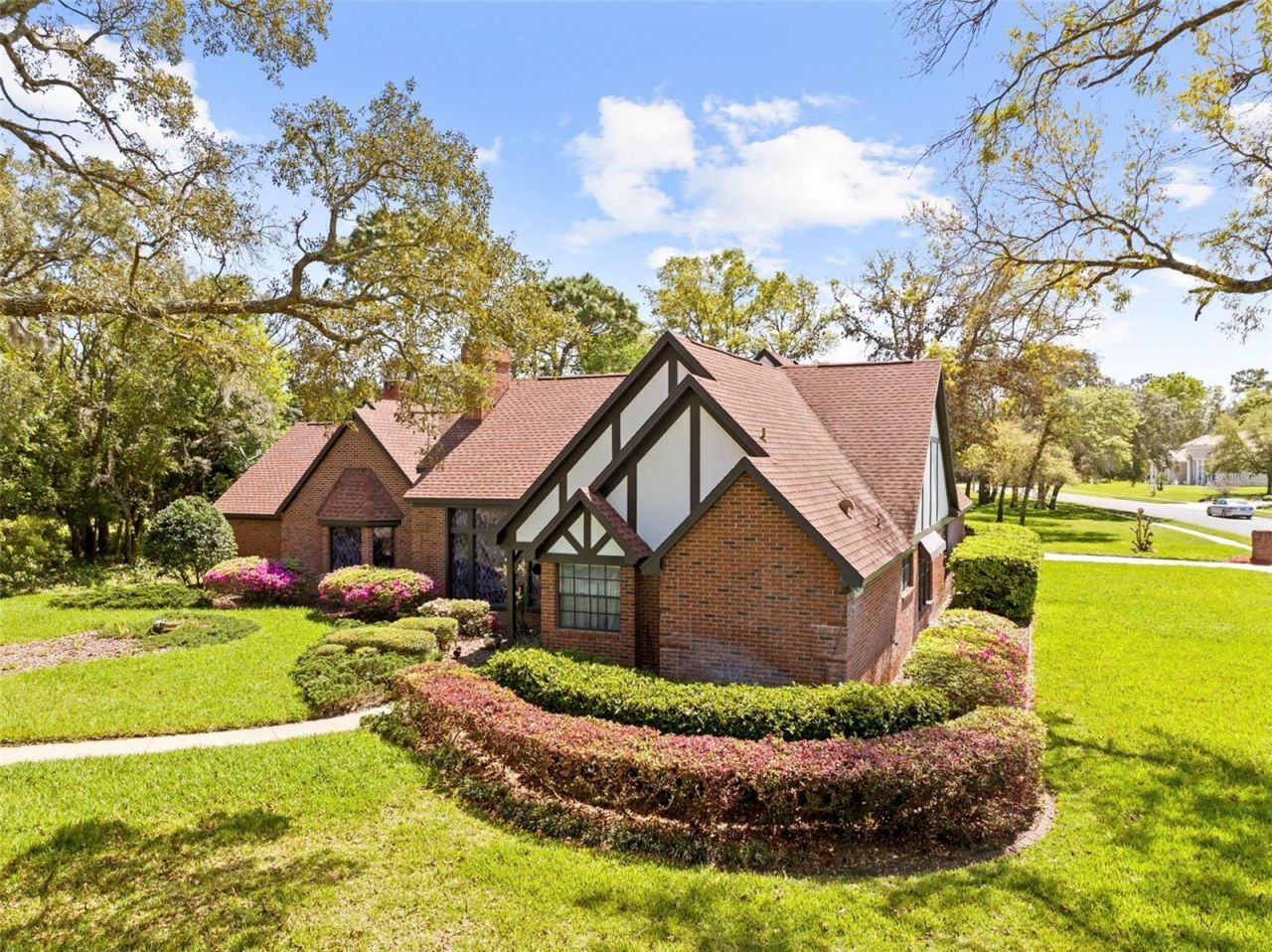 This beautifully crafted Tudor-style home is surrounded by mature landscaping that enhances both its curb appeal and overall charm. Large, established trees with expansive canopies provide abundant shade and a sense of privacy, creating a serene, park-like setting. A lush, green lawn stretches across the front yard, complemented by a clean concrete walkway leading to the home.Thoughtfully maintained landscaping includes a neatly trimmed hedge along the front, along with colorful flowering plants featuring pink and purple blooms that add a welcoming touch near the entry and beneath the shade of the grand central tree.Inside, the home continues to impress with its timeless character and inviting design. Steeply pitched gables, decorative half-timbering, and a blend of brick and stucco highlight its classic Tudor architecture. Rich hardwood flooring, vaulted ceilings with exposed wood beams, and abundant natural light create a warm and open atmosphere throughout.The kitchen is both functional and stylish, offering wood cabinetry, granite countertops, stainless steel appliances, and a spacious center island-perfect for everyday living and entertaining. The home also features a striking natural stone fireplace and a unique spa-like bathroom with a curved river rock shower, adding to its one-of-a-kind appeal.Step outside to a private backyard retreat featuring a screened-in pool, covered lanai, and brick patio surrounded by lush greenery-ideal for relaxing or hosting guests year-round.Blending architectural elegance with beautifully maintained outdoor spaces, this home offers a truly inviting and distinctive living experience.