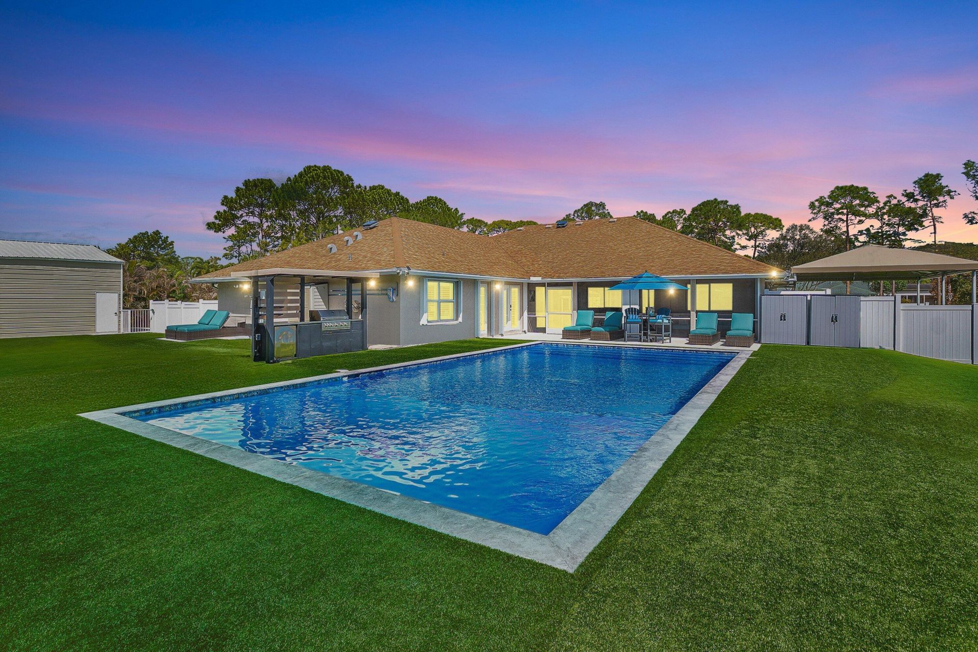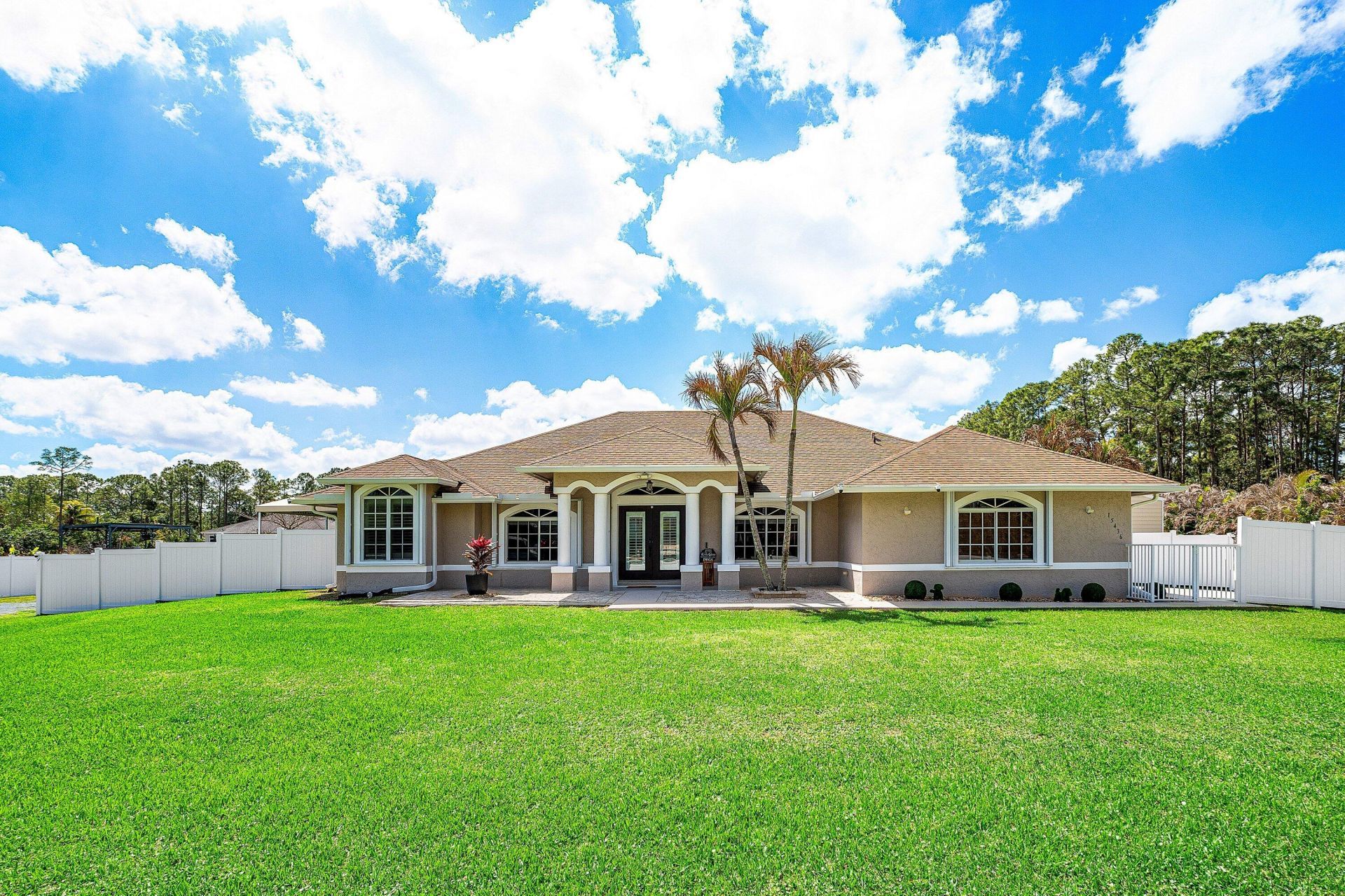 WELCOME HOME This well appointed estate home is resting on a premium 1.14 acre lot and boasting 5 bedrooms, PLUS den, 3.5 baths, spectacular 2024 saltwater pool with heat/chill automation, 2 car attached garage PLUS a 2022 shop, extras, upgrades and updating galore, 2026 BRAND NEW roof coming soon (see photos), 24KW whole house 2022 generator, practically new but better and offering the perfect blend of luxury, function and this beauty is in a superb location! ENTERING the elegant electric entry gate brings you inside where you will discover a convenient 2024 126'x24' concrete driveway and that this rare find is resting on a high and dry fully fenced lot with no pond. Then you will be greeted by the grand front patio and hurricane impact double front doors that bring you inside (CLICK) where you are greeted by soaring 13' ceilings, high-end flat wall finish, beautiful millwork, windows galore and loads of natural lighting, spectacular kitchen that features 42 inch cabinets, granite countertop with marble backsplash, dual pantries, soft close cabinets and drawers, stainless steel appliance package, spacious bar with a stone wall and a lovely breakfast nook that overlooks the pool and abundant green space. PASSING THROUGH you will find a modern farm house feel, dynamite split floor plan with DUAL primary suites boasting pool and green space views and one suite has a private exterior entry that is perfect for multi-generational living, this beauty is meticulously maintained, plantation shutters, french doors, blackout blinds, tray ceilings, luxury REAL wood and tile plank flooring, sliding barn doors, wainscoting, double vanities, lovely color palette with tree wall appliqu?s that if per buyer the owner is happy to removed, his and hers walk-in closets, beautiful arched windows, countless smart home features throughout, spa-style baths with deluxe soaking tubs, spacious walk-in showers with accent walls, linen closets, under AC laundry room with cabinetry and front loading Samsung package and a design that is exquisite! STEPPING OUTSIDE brings you into a your very own private resort-style retreat... 31' x 13' screened in lanai, 2024 outdoor kitchen, 2025 sparkling saltwater 40' x 20' pool with grand full width entrance steps, sundeck, bench seat and southern exposure, lush and low maintenance artificial turf backyard and two side yards, cabana bath, (4) 30' x 35' sail shades/kites with posts providing UV protection and reduces temperatures, (2) deluxe/heavy duty canopy tents that are perfect for outdoor fun and pets, mature pine trees, triple Christmas palms, eureka palm hedges providing extra seclusion, raised gardens, even the entire grass areas were fully sodded (2) convenient driveways, smart irrigation system on it's own well and so much more. Simply, a perfect space for quiet time, cozy fires, family gatherings, entertaining and enjoying Florida living at its best. HELLO SHOP, EXTRAS, SAVINGS, PEACE OF MIND & CONVENIENCE 30'x24' (720 sq ft) Eversafe shop with 100 AMP service, organized wall storage, oversized 12'H x 10'W garage door + side entry, and a 200 sq ft AC fitness room. Built with premium American commercial steel, hurricane code approved, A+ BBB rated manufacturer with 40+ years experience-ideal for workshop, gym, storage, or business use. New or newer fans, fixtures, appliances, and systems throughout, countless smart home and energy efficient features, the entire attic is insulated to 7 inches, solar attic fans, two newer AC units with UV lighting, two newer water heaters (one is tankless), fully fenced and features four sections, whole house generator ensuring uninterrupted power supply and 500 gallon propane tank, state-of-the-art peroxide water system, gutters throughout, complete 2025 accordion shutters and full hurricane protection (even the screened in patio is enclosed with accordion shutters) and so much more! LOCATION LIFESTYLE FREEDOM The Acreage is located in Palm Beach County, which is home to one