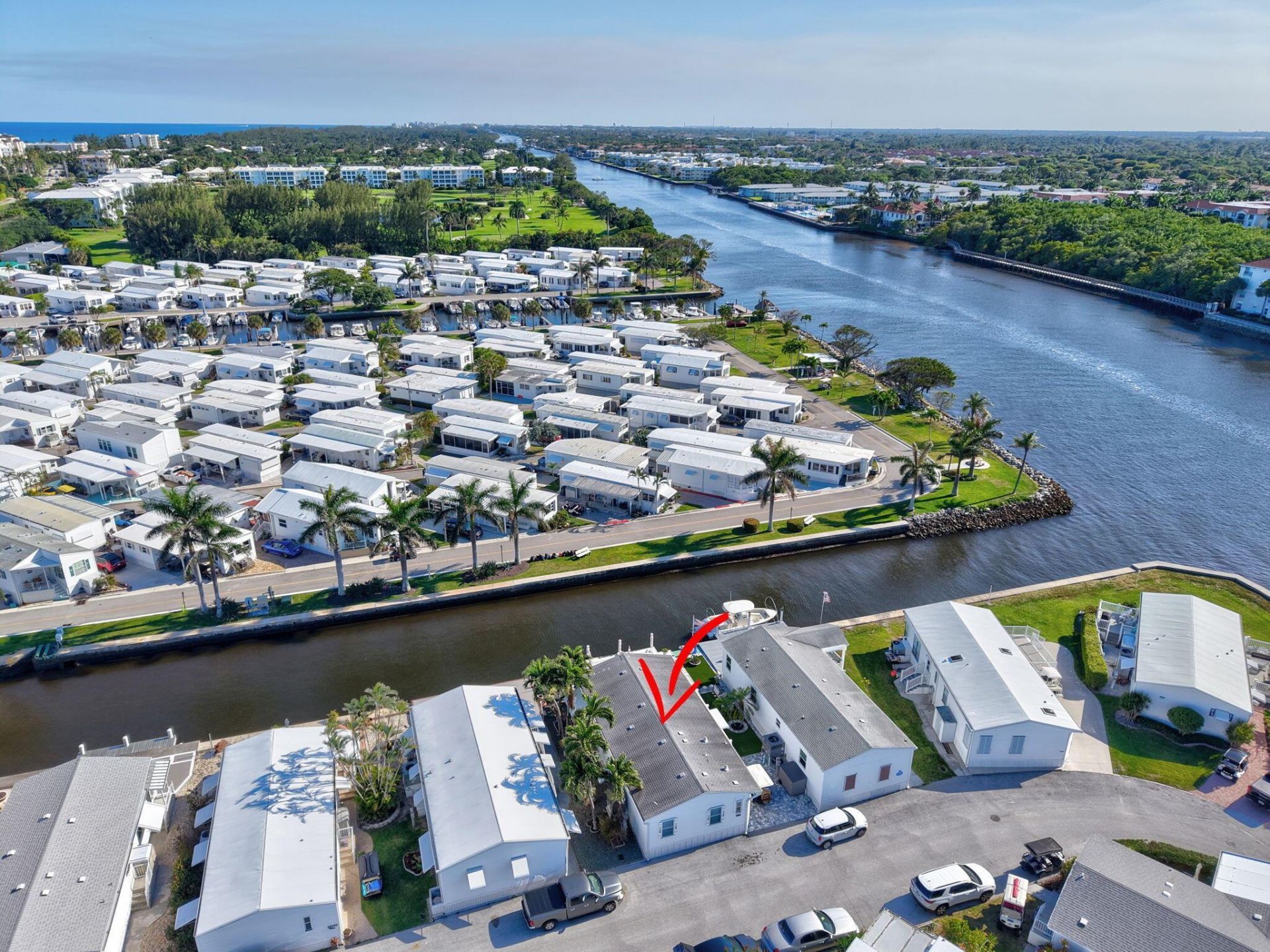 Fantastic Briny Breezes canal front home with views of the intracoastal, magical sunsets and all that Briny has to offer. Spacious 2/2 w/vaulted ceilings, expansive open floorplan, lots of windows, tastefully decorated and move in ready. Newer AC, tankless hot water heater and hall bath recently re-done. Full deck and dock, marble pavers and artificial turf, electric roll out awning for shaded dining and so much more. Only 3 units from intracoastal with forever views. Briny Breezes has something for everyone with Oceanfront Clubhouse, stunning private beach, endless intracoastal frontage, with parks, picnic areas, clubs and non-stop activities. There is something for everyone at Briny. Minutes to great restaurants, stores and a quick ride to the airport too. 46 shares in Co-Op.