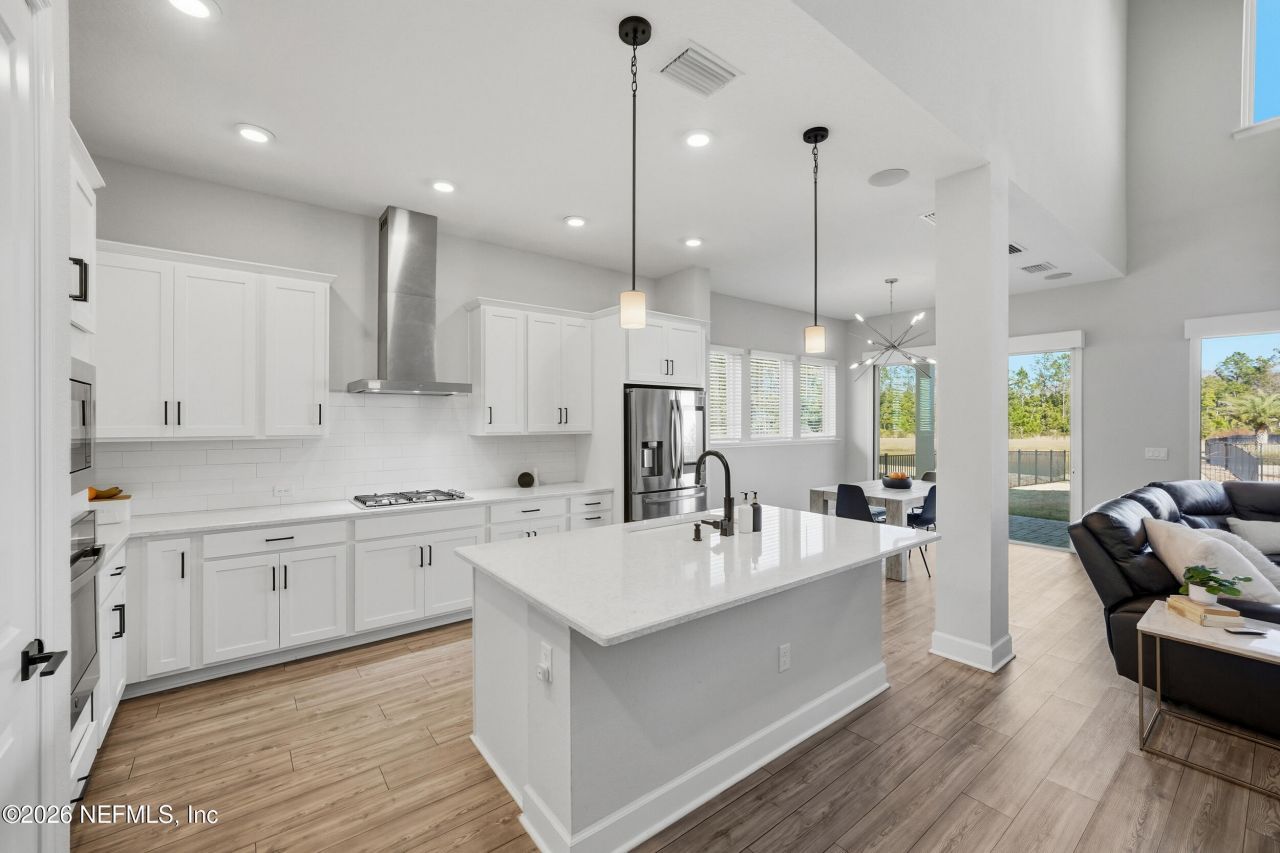Stunning David Weekley home in the well desired community of Settler's Landing at Nocatee! Built in 2022 offering 4 bedrooms + office + loft. The primary bedroom and office are on the first floor with the other 3 bedrooms and loft on the 2nd floor. Two-story living room with double-stacked windows and triple sliders (all equipped with electric shades) fills the home with natural light and peaceful pond to preserve views. Features include Quartz countertops, tile backsplash, touch screen refrigerator, motorized roller shades, surround sound, a Shark Coatings premium polyaspartic garage floor, custom garage shelving and ceiling racks, electric car charger, black aluminum fencing, a whole-home water softener and gutters. Short golf cart ride to Pine Island Academy and Nocatee's award winning amenities including water parks & pools, dog parks, tennis and pickleball courts, fitness center, kayak launch and more! - Luxury Vinyl Plank Floors- Quartz countertops- Gas Stove with Hood vent-Touchscreen Refrigerator- Tile Backsplash- Staircase with Iron Railings-Built-In Speakers- Tray Ceiling in Primary Suite- Fully fenced backyard- Motorized roller shades- Shark Coatings premium polyaspartic garage floor- Electric Car Outlet- Smart Thermostat- Extended Covered Lanai with Pavers- Custom garage shelving and ceiling racks- Whole home water softener - Whole house gutters- Drop Zone off of garage- Pendant & Custom Lighting- Pavered Driveway and Front Porch