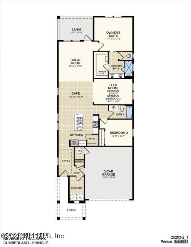 The Cumberland Floor Plan - Reverie at TrailmarkThe Cumberland is a 1,581-square-foot single-story home offering 2 bedrooms, 2 bathrooms, a flex room, and a 2-car garage. Designed with everyday comfort in mind, it features an open living area that flows from the kitchen to the great room and dining space, making it ideal for both daily living and entertaining. The versatile flex room can be used as a home office, hobby space, or den, while the private primary suite offers a peaceful retreat. Perfect for the active lifestyle in the vibrant community of Reverie at Trailmark. This home features, Low Country Elevation, 9' ceilings with tray ceiling in the great room, 8' doors, white cabinets, quartz countertops, tile and Laminate flooring, paver driveway.