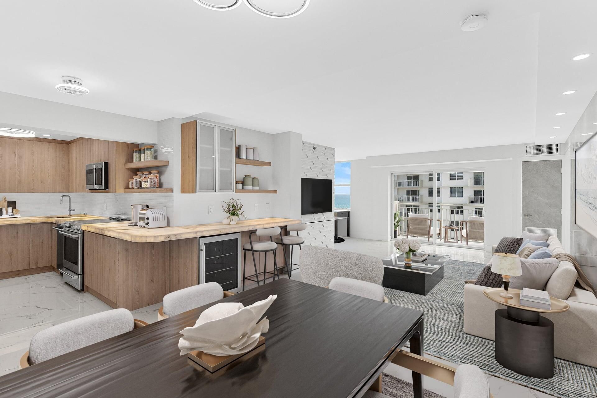 Totally renovated high floor at 45 Ocean. Split 2 bedroom, 2 full bath floor plan, beautifully designed with WOW factor finishes. Directly on the sand building in Highland Beach with direct ocean views. Condominium amenities include an oceanfront pool and private beach access. Custom kitchen features Thermador appliances, illuminated quartzite lighting countertop, and a wine cooler. The living and dining areas feature designer finishes, LED ceiling lighting, and a custom glass fireplace wall. Both bedrooms offer custom closets, glass doors, and spa-inspired baths with European fixtures and finishes. Virtually Staged. The building offers a security gate, a pool, gym, BBQ area, and assigned garage parking, and is located in an excellent area near Downtown Boca and Downtown Delray Beach